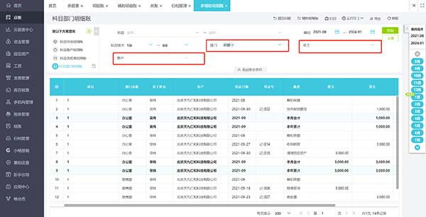 返回到科目部门明细账界面,可以看到出现【部门】、【员工】、【客户】辅助核算,根据这些可以筛选对应条件,可以将多辅助核算查询在一张表中