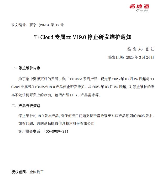 一、停止维护内容 为了集中资源更好的发展、推广T+Cloud系列产品,现定于2025年03月24日起对T+Cloud 专属云/T+OnlineV19.0产品停止研发维护。从2025年03月24日起,对停止维护的版本不做任何开发上的改动,包括产品 BUG、产品需求等, 二、产品升级策略 停止维护的 19.0 版本产品,有任何应用问题支持平滑升级至对应产品序列的2025 版本,如有问题,请联系畅捷通信息技术股份有限公司