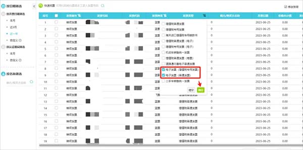 4、后续再提取发票时,点击“税务数字账户”,可按左侧时间栏选择,会显示税务数字账户中存在的发票信息。如想提取数电发票,点击发票类型,选择电子发票,点确定: