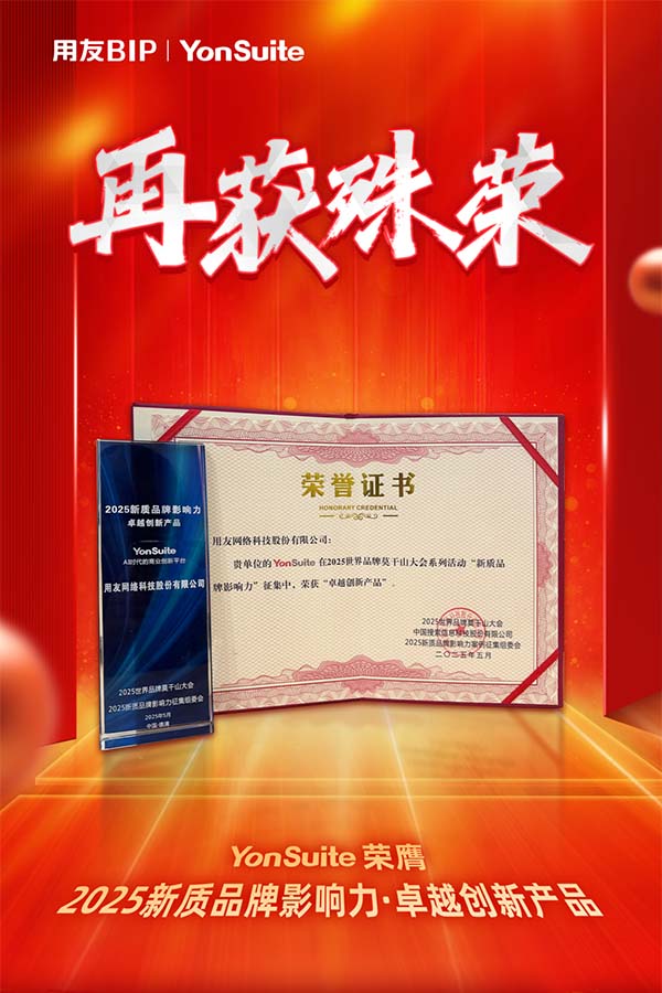 恰逢中国品牌日,5月9日至11日,以“品牌,让世界更美好”为主题的“2025世界品牌莫干山大会”在浙江德清盛大召开。这场备受瞩目的国际盛会由新华社等权威机构主办,吸引了全球顶尖企业与行业领袖,共探讨品牌与技术驱动社会进步。会上,用友YonSuite凭借其卓越的技术实力、前沿的创新理念以及广泛的行业影响力,荣摘“2025新质品牌影响力·卓越创新产品”奖。这一殊荣不仅是对YonSuite在AI与数智化领域领先地位的高度认可,更是对其在赋能中国企业高质量发展、推动全球商业变革方面所做出的杰出贡献的充分肯定。