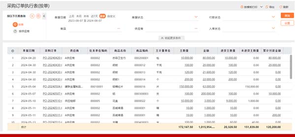 采购订单执行表:ERP需要按天/周/月/季度/年/自定义时间段,查询统计不同供应商,不同商品的采购历史明细及汇总,与供应商的进货入库明细。