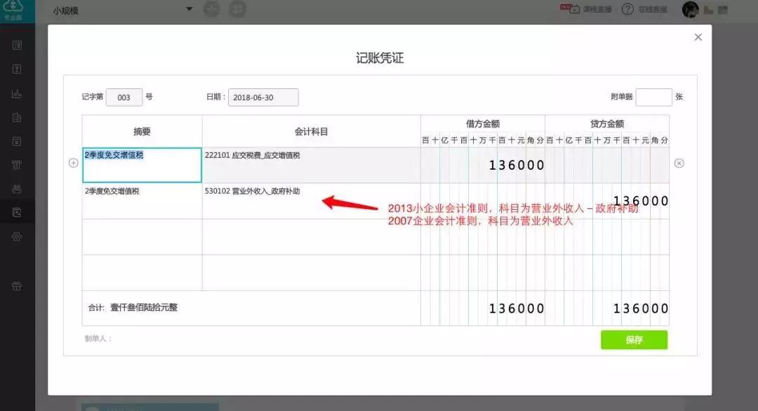 对于小微企业季度申报,“好会计”也紧跟政策推出了相对应的功能辅助会计们的工作,推出季度月末期末结转“免交增值税”和“回冲税金”的模板。营业季度收入小于等于30万自动生成免交增值税和回冲税金凭证;如果营业季收入大于30W,系统会自动给出提示是否还需要继续结转。