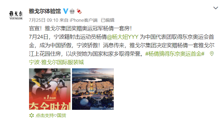 7月24日,00后杨倩参加10米气步枪射击项目,为我国拿下首金,值得欢呼雀跃。在杨倩取得首金后,一天之内在新浪微博粉丝上涨了53万,并且在赛事结束的第二天,雅戈尔集团宣布,要赠送给杨倩一套房。