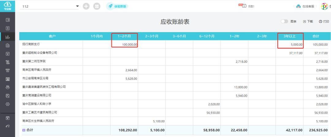畅捷通好会计内置【应收账龄表】,按照每个账龄区间自动统计应收账款余额,方便直接查看数据。也可以直接将报表导出发给业务人员,方便催收。还可以通过【辅助核算余额表】与【辅助核算明细账】直接查看每家客户的详细情况。