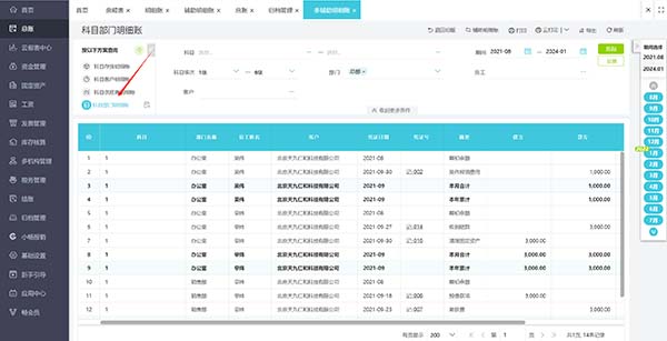 返回到科目部门明细账界面,可以看到出现【部门】、【员工】、【客户】辅助核算,根据这些可以筛选对应条件,可以将多辅助核算查询在一张表中