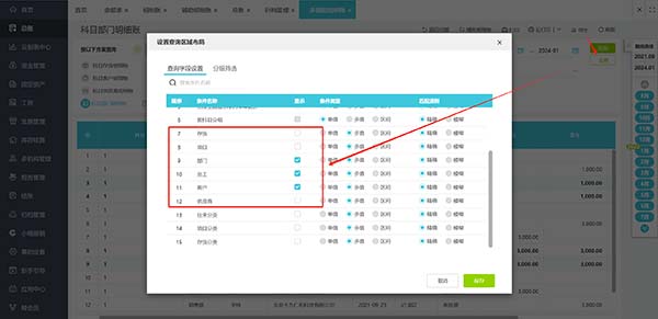 点击【设置】,会出现【设置查询区域布局】,勾选所需要的辅助核算显示,然后点击保存