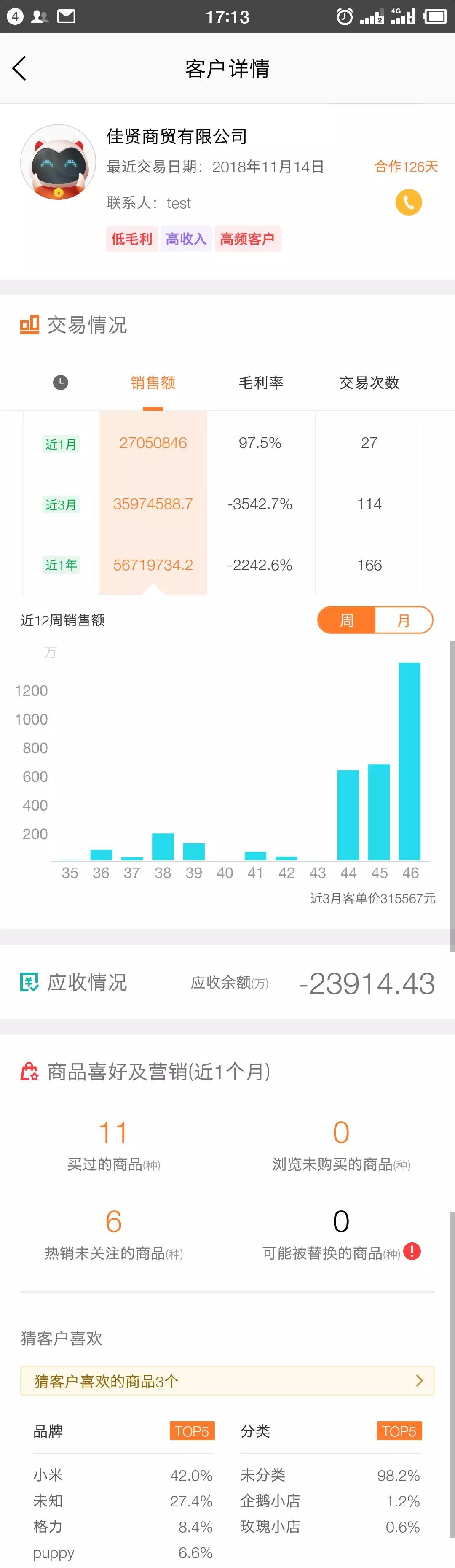 好生意对一个客户整体情况进行刻画,其中包括合作时间、最近一次交易;近1个月、近3个月、近1年的交易情况和销售趋势、应收情况;以及客户对商品和喜好情况进行统计、分析。最终分为:客户浏览未购买的商品、热销未购买的商品、可能被替换的商品、猜客户喜欢的商品等,通过这些数据、分类,商家可以占据主动营销的地位。