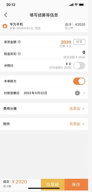 选择完商品之后,点击【结算】,在弹出的【填写结算等信息】的界面上,根据实际情况进行选择,是否要抹零,是否要本单赊欠。