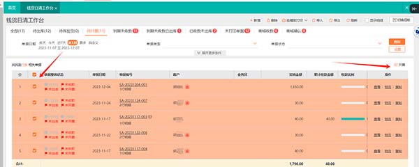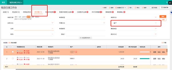 1、点击【销售管理】-【钱货日清工作台】-【待开票】,在表头筛选下要开票的客户名称。