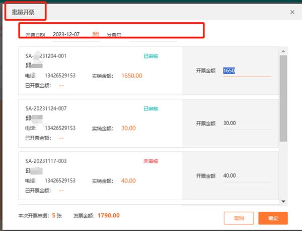 2.勾选要进行开票的单据,点击表体右上角的【开票】,输入发票号、开票日期等数据,即可对多张单据进行开票处理。