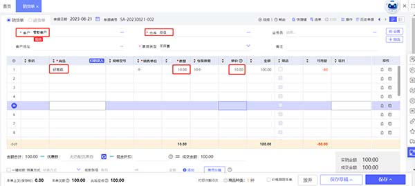 第二步:选择客户【没有录入可以临时录入客户信息】、仓库、商品
