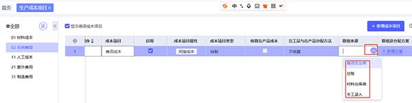 C. 点击保存后,选择取值来源,值来源可以选择总账、材料出库单、费用支出单、手工录入中的其中一种。如果选择材料出库单,统计材料出库单上的成本金额;如果是费用支出单,统计费用支出单上的金额;总账是统计凭证中设置的科目中的数据;手工录入,分配的时候可以手工录入