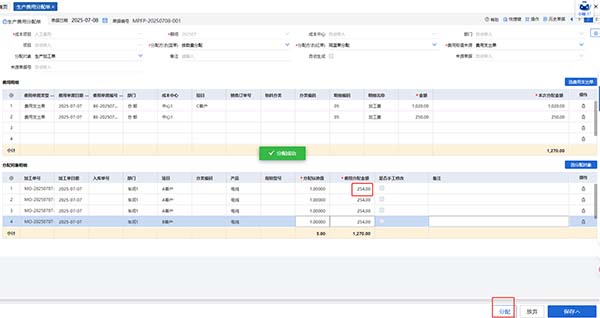 (6) 分配规则,可以选择按照按参考成本分配、按标准工时分配、按数量分配中一种。如果选择按照参考成本分配,在商品中填写参考成本;如果选择按标准工时分配,在商品中录入标准工时。红单选择和蓝单一起分配,或者选择成不分配。