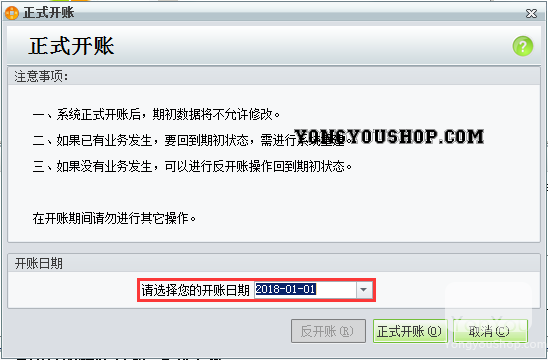 5、年结存后,核对账目无误,确保年结存没有问题后即可正式开账,将开账时间修改为2018年01月01日;