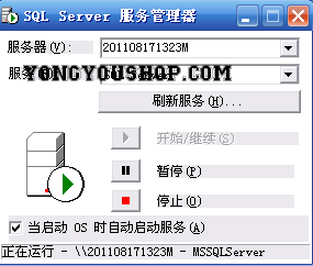 其中双击sqlmangr.exe,即可弹出类似如下的“SQL Server服务管理器”对话框,其中可以在“服务器”组合框中指定你的应用服务器指向哪个数据库服务器,如果你的T6是完全安装在同一个电脑上,则将自动默认为你的电脑名,如果电脑名后来进行了修改,那么修改后应该再在此处将“服务器”组合框的值重新修改为你的电脑的新名。另外,还会在屏幕的右下角出现“