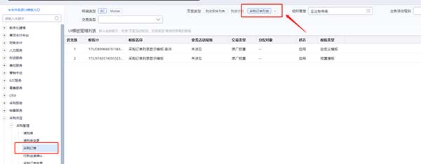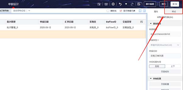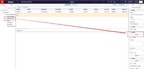 4、在设计页面左侧层级区域展开采购订单列表,选择【采购订单列表区域】,然后右侧点开【特征配置】-【字段设置】,进入【字段设置】界面