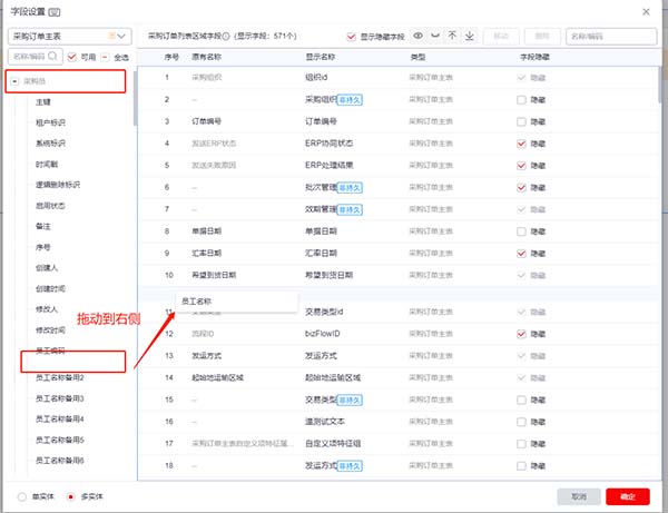 5、在【字段设置】中,找到采购员-员工名称字段,鼠标单机选中这个字段将其拖动到右侧。