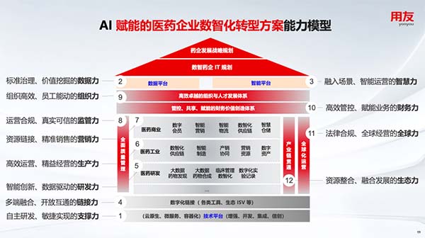 对于药企如何正确、成功推进数智化转型,用友总结了服务众多不同规模企业的数智化实践,提出了“企业数智化123”的能力进阶模型:
