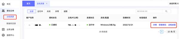 使用下单账号登陆畅云管家管理平台(cjtmsp.com),点击[基础运维]-[主机资源],可以查看当前开通的机器,点击[详情]可以查看具体信息,点击[获取密码]可以获取机器的登陆密码,点击[远程桌面]可以直接通过控制台远程登录机器