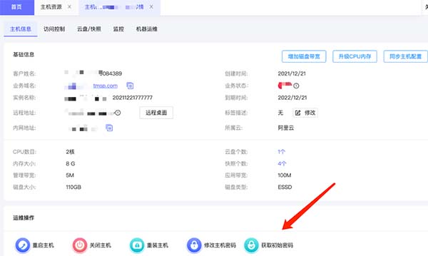首次登陆需在详情页点击【获取初始密码】,增购硬盘及带宽后也可以在这里点击同步配置