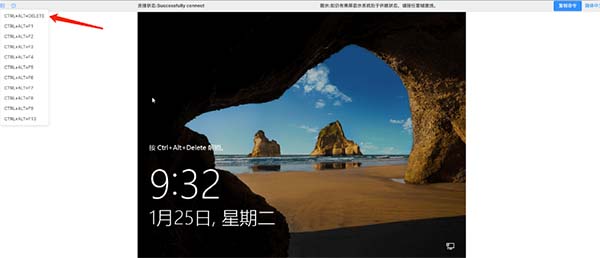 点击[远程桌面]远程登录服务器后,稍等片刻即可在新打开的浏览器页签中看到您的云主机,鼠标移动到屏幕左上角,在弹出的命令菜单中,选中第一条命令:"CTRL + ALT + DELETE" 点击命令即可对主机进行解锁,如下图所示