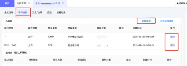 如需新增/关闭服务器端口,可以点击[访问控制]-[新增策略],进行开放端口的调整