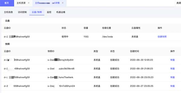 畅云管家机器开通后,每日进行一次数据的全量自动备份,备份时间为晚上七点。默认在云端保留最新的三天数据。如需手工备份,可点击[云盘/快照]-[创建快照],如需进行数据回滚,可选择对应时间的备份,点击[恢复]即可