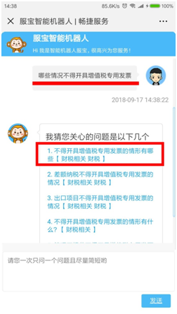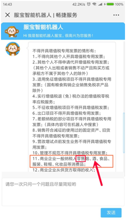 挂了电话,会计(老总的侄子,是不是关系有点乱?)赶紧打开微信的公众号,找到“畅捷服务”-【我要提问】-【服宝机器人】,编辑:哪些情况不得开具增值税专用发票,点击【发送】