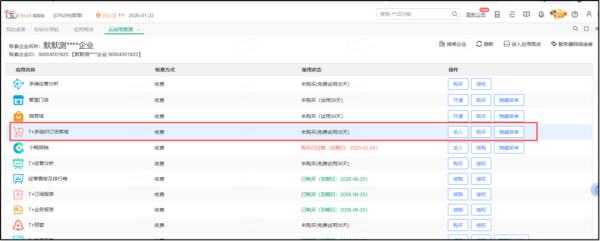 推荐直单模式,管理员登录该企业,在【T+云应用管理】里,选择【T+新订货商城】