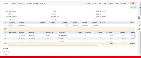 组装生产:无固定物料清单(BOM)的组装拆卸,所需材料种类及数量经常变换,或是加工的产品只是一次性的,自动归集材料成本及制造费用到成品成本。