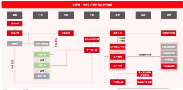 以好业财ERP系统为例,通过六大核心模块形成智能解决方案,提供从订单到发货全流程信息管理。打通进销存和生产管理的信息壁垒,帮助制造企业降低制造成本、提高协作效率、保障产品质量。