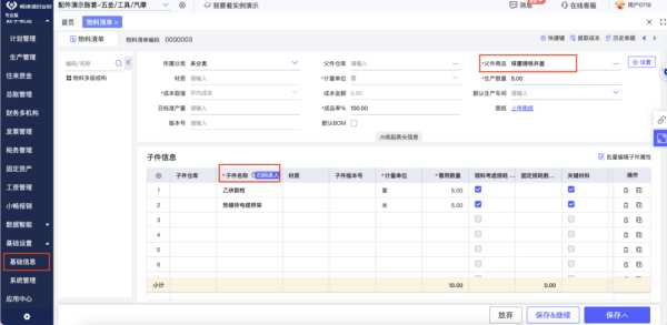功能模块:【基础信息-物料清单】、【生产制造-计划预算】、【管理会计-成本核算】