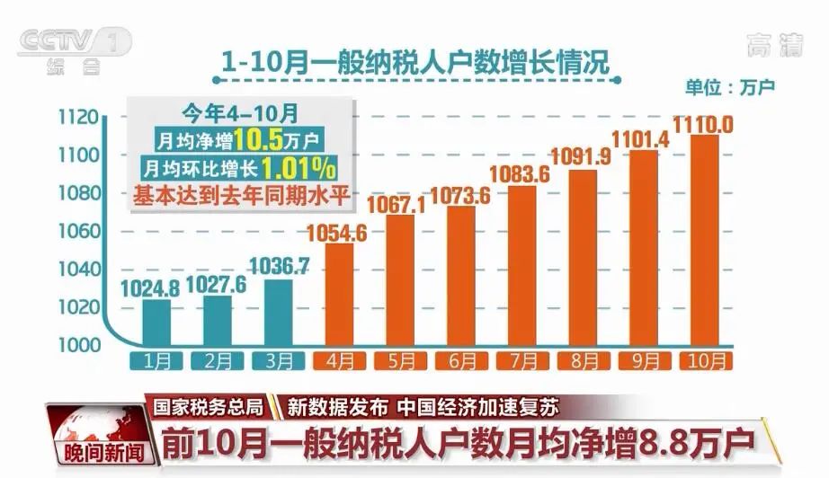 全国一般纳税人户数月均净增8.8万户,月均环比增长0.86%,实现稳定增长。特别是二季度以来,随着生产秩序有序恢复,一般纳税人户数月均净增10.5万户,月均环比增长1.01%,基本达到去年同期水平。