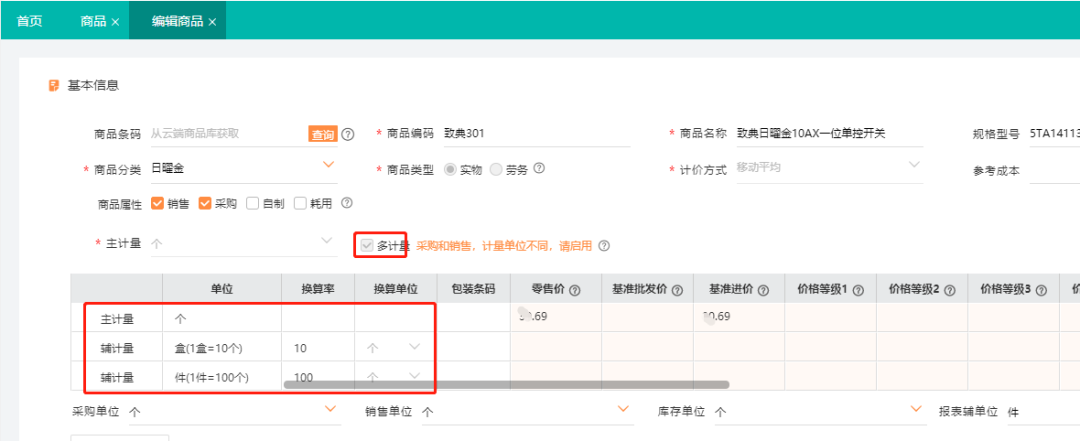 畅捷通好生意能对产品进行多单位管理,在下图的“商品档案”界面启用多单位,录入单位的间换算率即可。