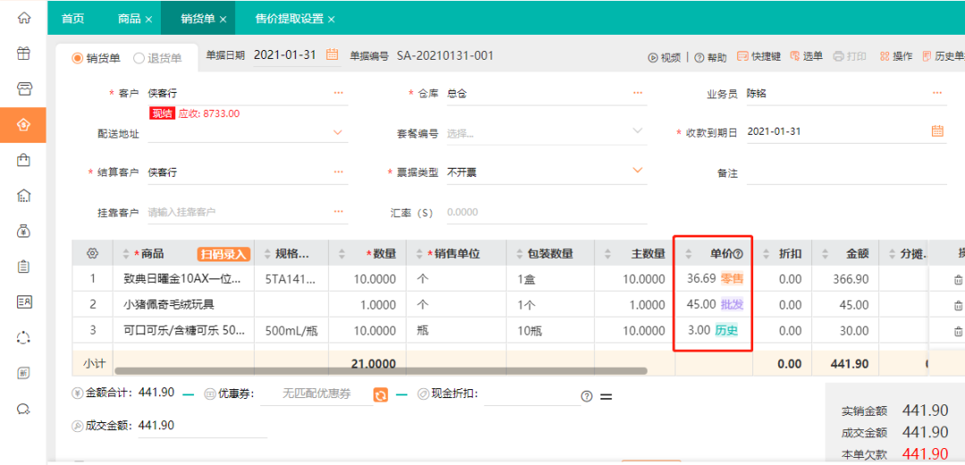 通过畅捷通好生意的销售开单,自动带出价格,协议价、零售价、历史价价格一目了然。