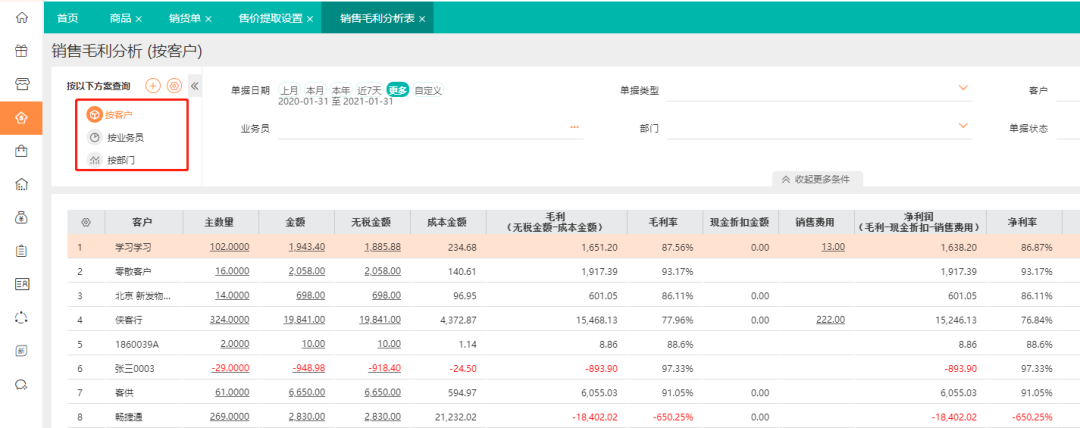 随时查看汇总销售数据,客户、业务员、部门乃至商品的毛利情况。