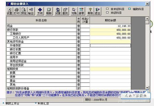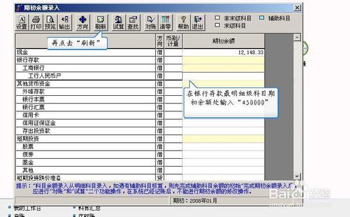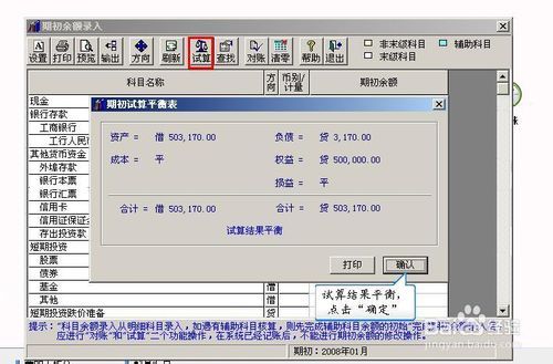 在相应的科目栏中录入相关的数据,包括现金、银行存款、应收账款、固定资产、累计折旧、应付账款、实收资本等相关数据。这里需要注意的是有些二级科目需要我们进行刷新处理。最后需要点击试算,判断试算是否平衡,如果平衡点击确定按钮。