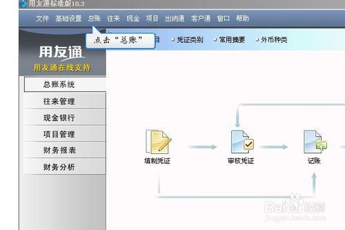 单击用友菜单右边的“总账系统”进入到总账系统中的控制界面,此后会有一段等待的时间需要我们进行等待软件进入总账系统。