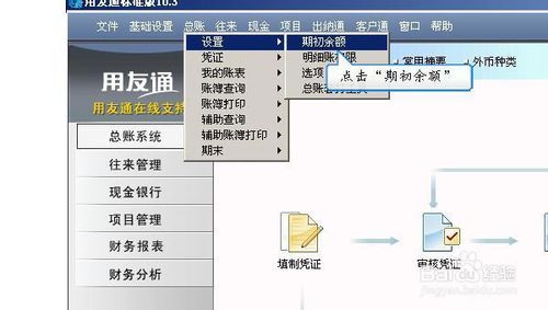 点击顶部菜单中的总账菜单,在下拉菜单中选择相应的选项,主要的目的是进行期初数据的录入,具体的步骤“总账”“设置”“期初数据”。具体步骤如图所示。