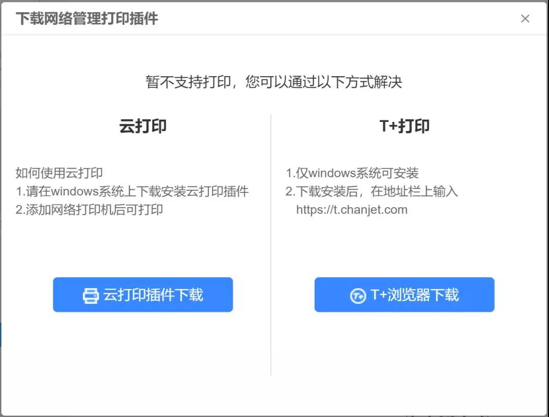 2 启用云打印后,当使用非T+浏览器时,使用打印功能或添加打印机时,提示下载网络打印插件,然后点击:云打印插件下载,下载完成后手工进行安装。