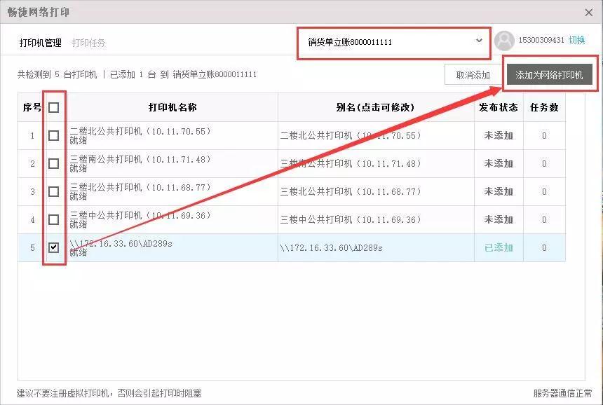 3 安装“畅捷网络打印”插件后,使用畅捷通账号登陆,选择对应企业后,将需要使用的打印机添加为网络打印机,添加完成后提示保存成功。