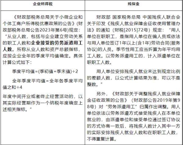 (1)企业所得税的从业人数包括企业接受的劳务派遣用工人数,而残保金的人数中,首先,劳务派遣人员是属于派出方的,其次,以派遣方式接受残疾人在本单位就业的,人员归属由派遣单位和接受单位通过签订协议的方式协商确定归属,这也可能存在口径差异。所以在人数统计方面,企业所得税口径的人数和残保金的职工人数就存在差异。